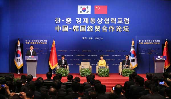 Chinese President Xi Jinping (1st L, back) speaks at a forum on China-South Korea economic and trade cooperation in Seoul, capital of South Korea, July 4, 2014. Xi Jinping and his South Korean counterpart Park Geun-hye attended the forum jointly on Friday.(Xinhua/Lan Hongguang)